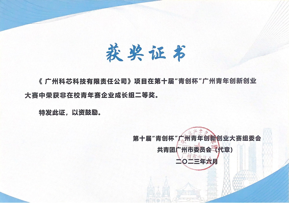 本次大赛,广州科芯科技有限责任公司凭借自主研发的 “企宗合同管理系统” ,在项目赛组总决赛中众多项目脱颖而出,斩获第十届“青创杯”广州青年创新创业大赛项目成长组第二名。