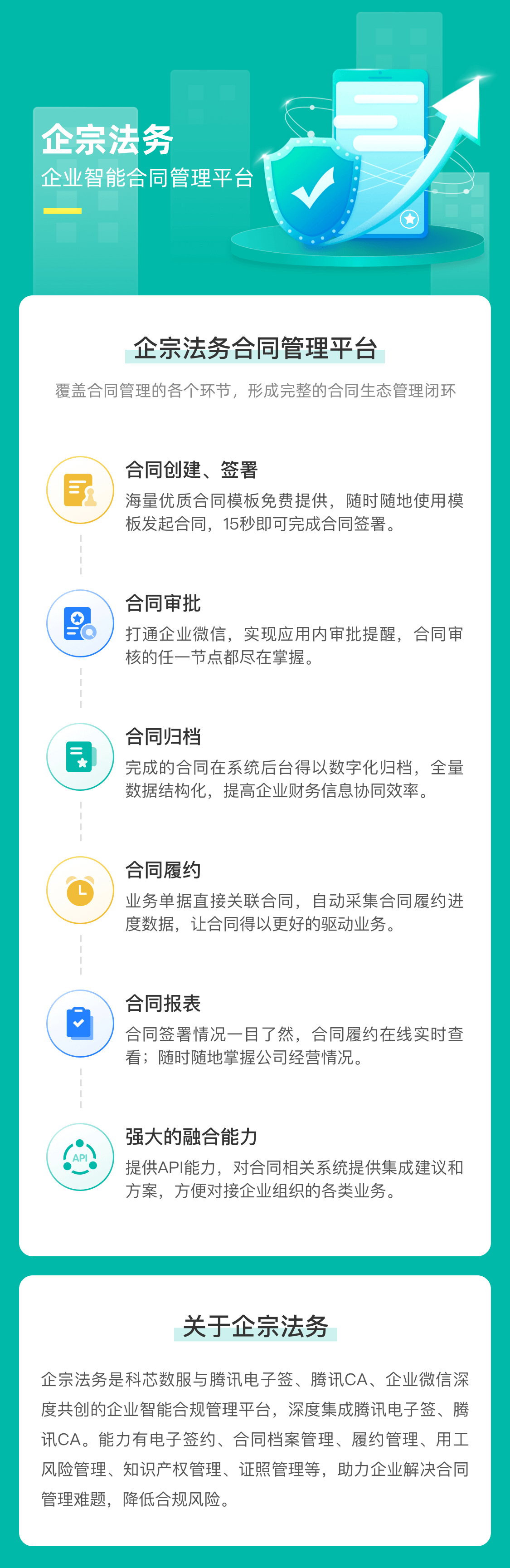 在此次合作中,企宗深度集成腾讯电子签的签约能力之余,更是拓展了企业合同全生命周期管理的不同节点,包括合同审批流、合同履约(签完合同后可在线上支付以及开具发票,并且进行收付款提醒)、合同归档、合同数据可视化,打造企宗人事通(以劳动合同、人事制度为中心的用工合规解决方案),企宗销售通(以销售合同、财务流程为中心的集合同、支付、发票、履约全链条解决方案),形成一整个合同管理的闭环,为客户提供企业合规数字化解决方案。