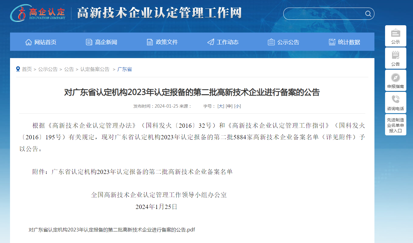 近日,高新技术企业认定管理工作网发布了《对广东省认定机构2023年认定报备的第二批高新技术企业进行备案的公告》,企宗科技成功荣获2023年度“高新技术企业”认证。这也是继2023年11月获得“创新型企业”后,企宗科技再次得到政府的认可。