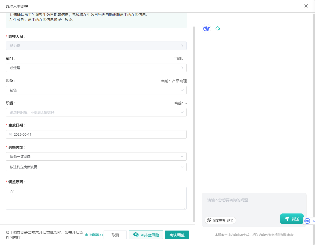 调岗审批:智能分析调岗合规性,预警潜在风险。