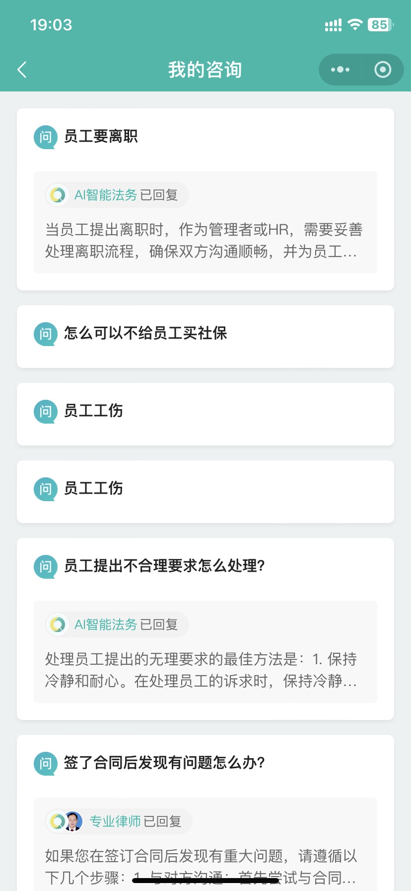 企宗人事通小程序推出7×24小时在线法务咨询服务,由AI+资深劳动法法务即时响应,免费解答企业在用工过程中遇到的各类法律问题,并提供专业可行的解决方案建议。该服务支持劳动合同、社保公积金、劳动争议等常见场景的快速咨询。