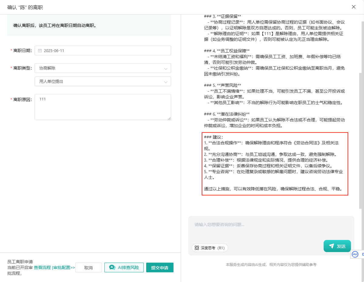 离职办理:自动生成离职解决方案,规避劳动纠纷。