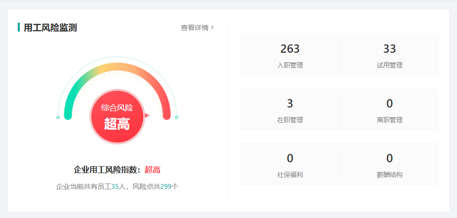 新版本引入用工数据分析看板,不仅展示企业用工的风险等级,更能深入分析风险来源:通过入职管理、试用管理、在职管理、规章制度、离职管理、社保福利六大核心板块的智能分析,为企业提供从风险预警到解决方案的一站式合规支持。
