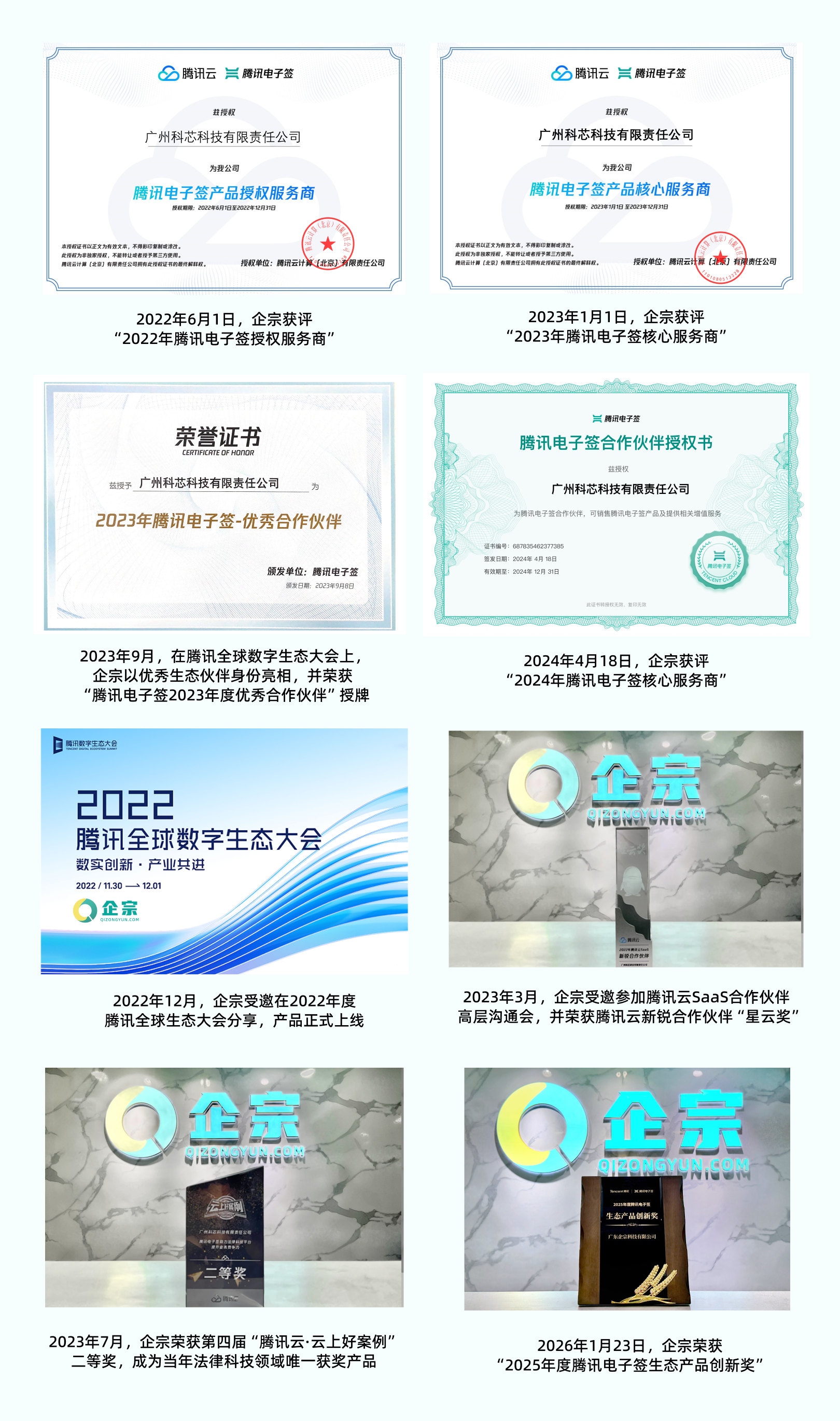自2022年起,企宗从腾讯电子签授权服务商逐步发展成为连续多年的核心服务商,并于2023年被评为年度优秀合作伙伴。期间,企宗在腾讯云生态评选中获得“星云奖”、“云上好案例”等行业奖项,2026年凭借产品创新再获“腾讯电子签生态产品创新奖”,企宗与腾讯电子签在持续共创中实现共赢。