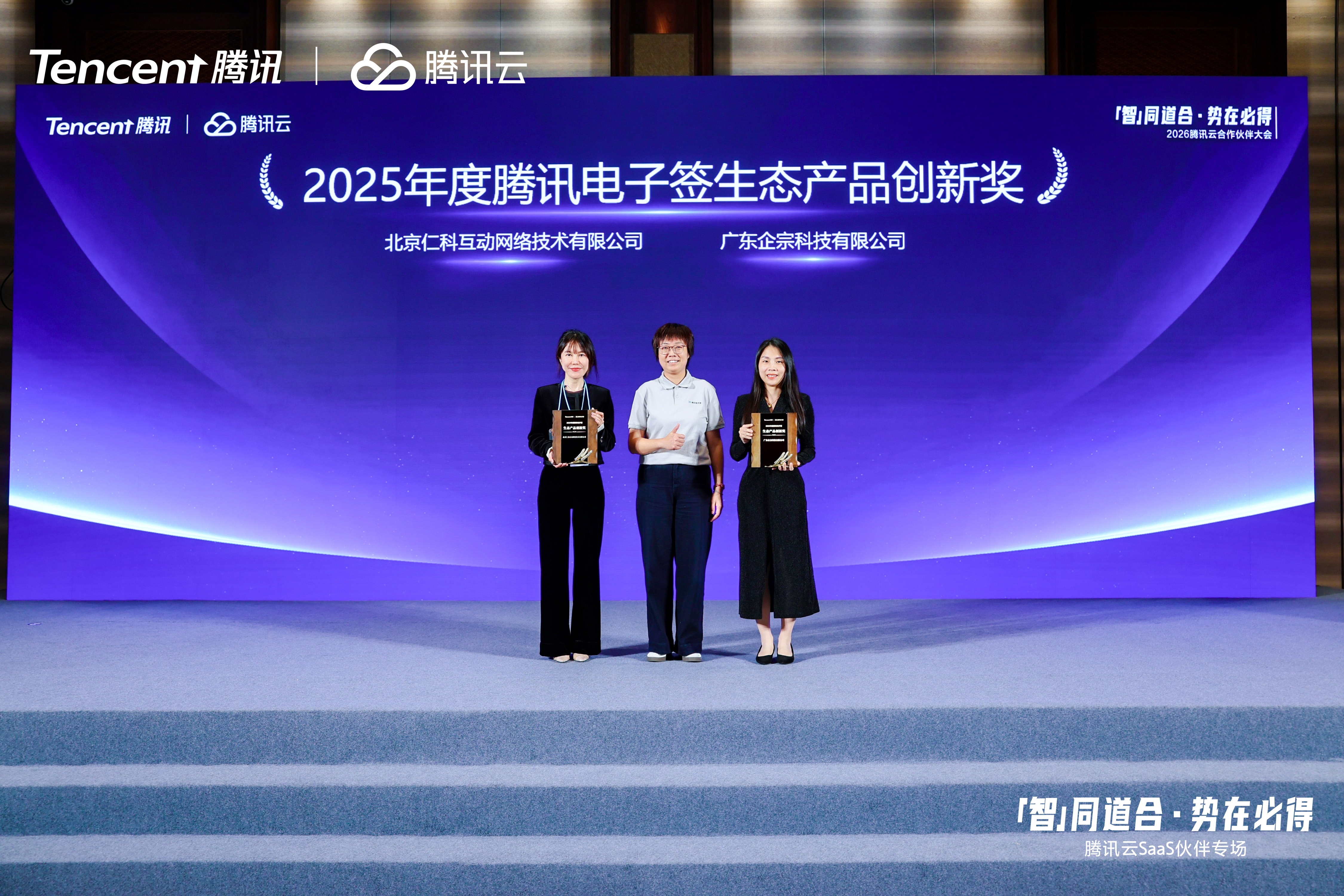 1月22日,“2026腾讯云合作伙伴大会”在三亚隆重召开,广东企宗科技有限公司(以下简称“企宗”)受邀出席,并荣获“2025年度腾讯电子签生态产品创新奖”。