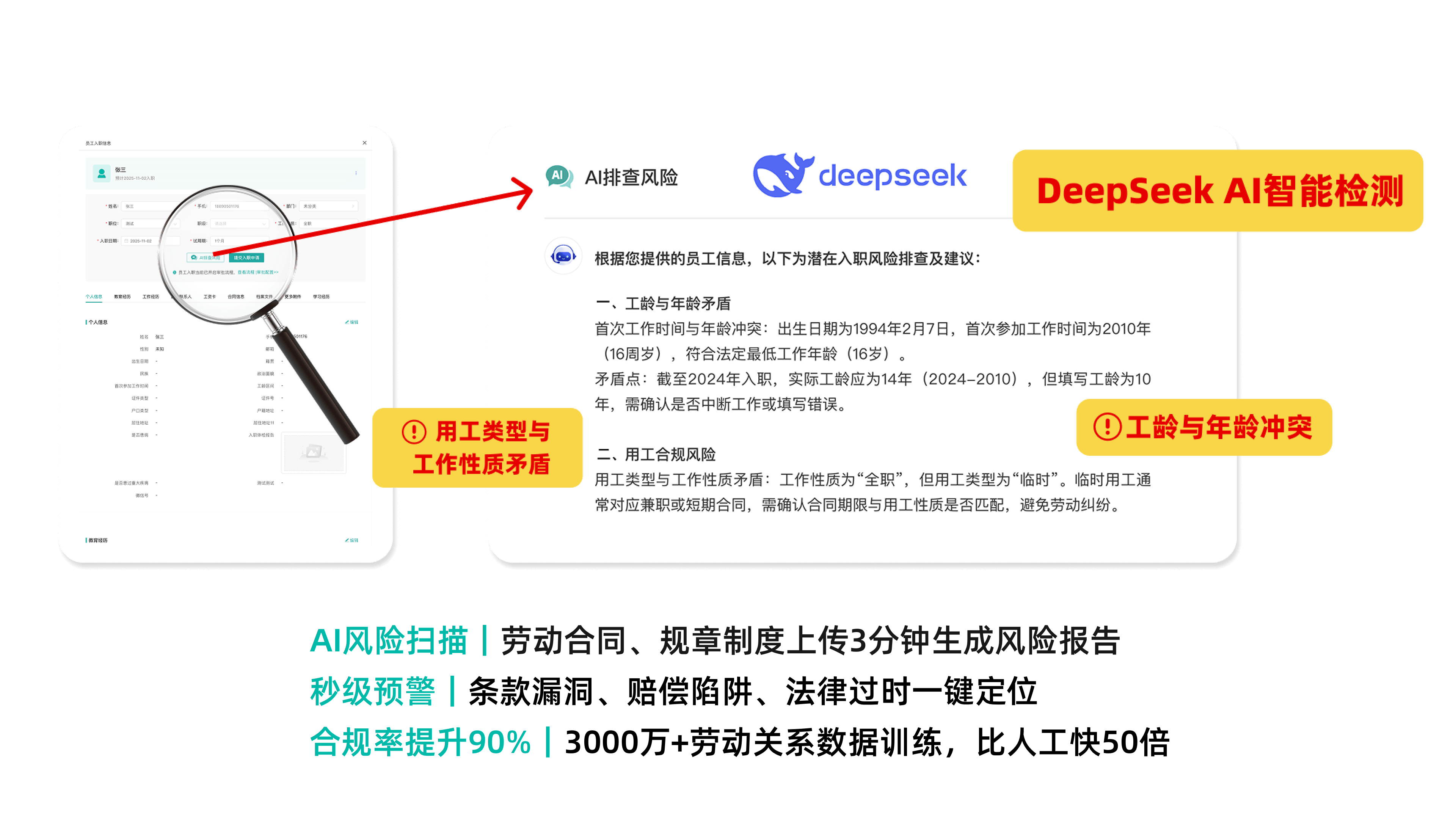 深度融合人工智能技术,接入Deepseek、腾讯混元等AI智能模型,把劳动法、各项法律法规及海量合规案例数据搬进系统