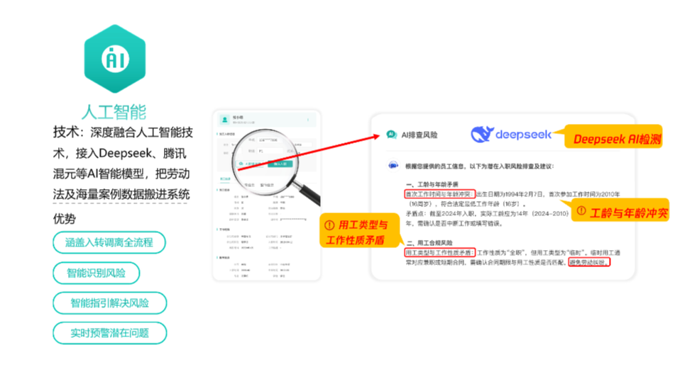 ●深度融合人工智能:系统深度融合头部人工智能大模型,自动检测员工入转调离全流程风险,智能指引化解风险,更智能更专业